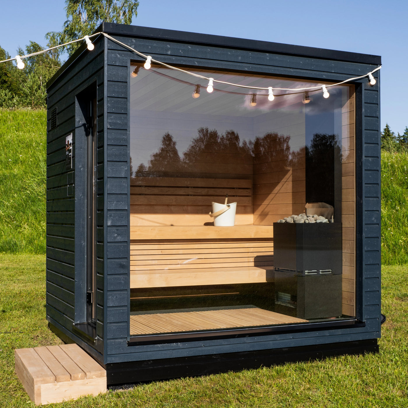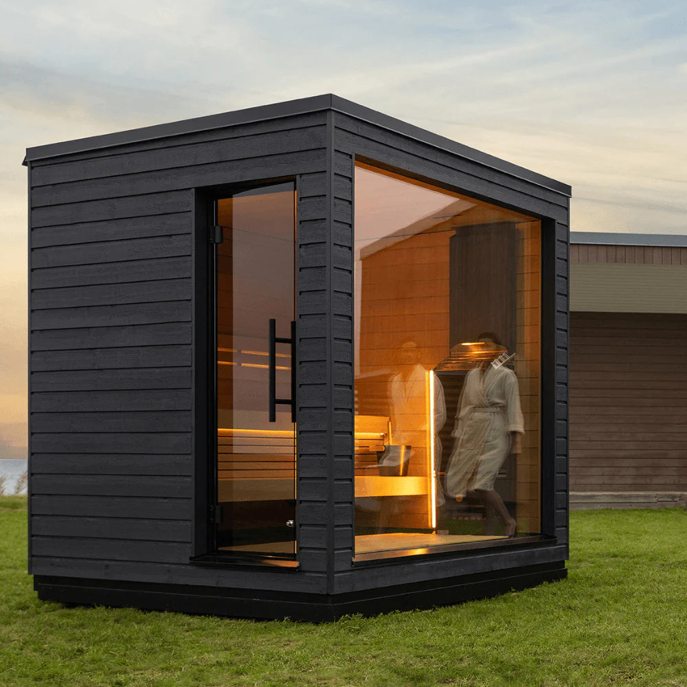 - Full double-glazed, clear tempered glass front wall for stunning sauna bathing views